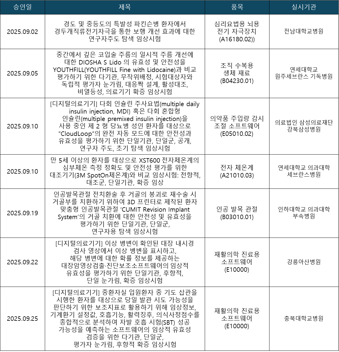 2025년 9월 한 달 동안 식품의약품안전처는 디지털의료기기 3건을 포함한 총 7건의 의료기기 임상시험을 승인했습니다.
